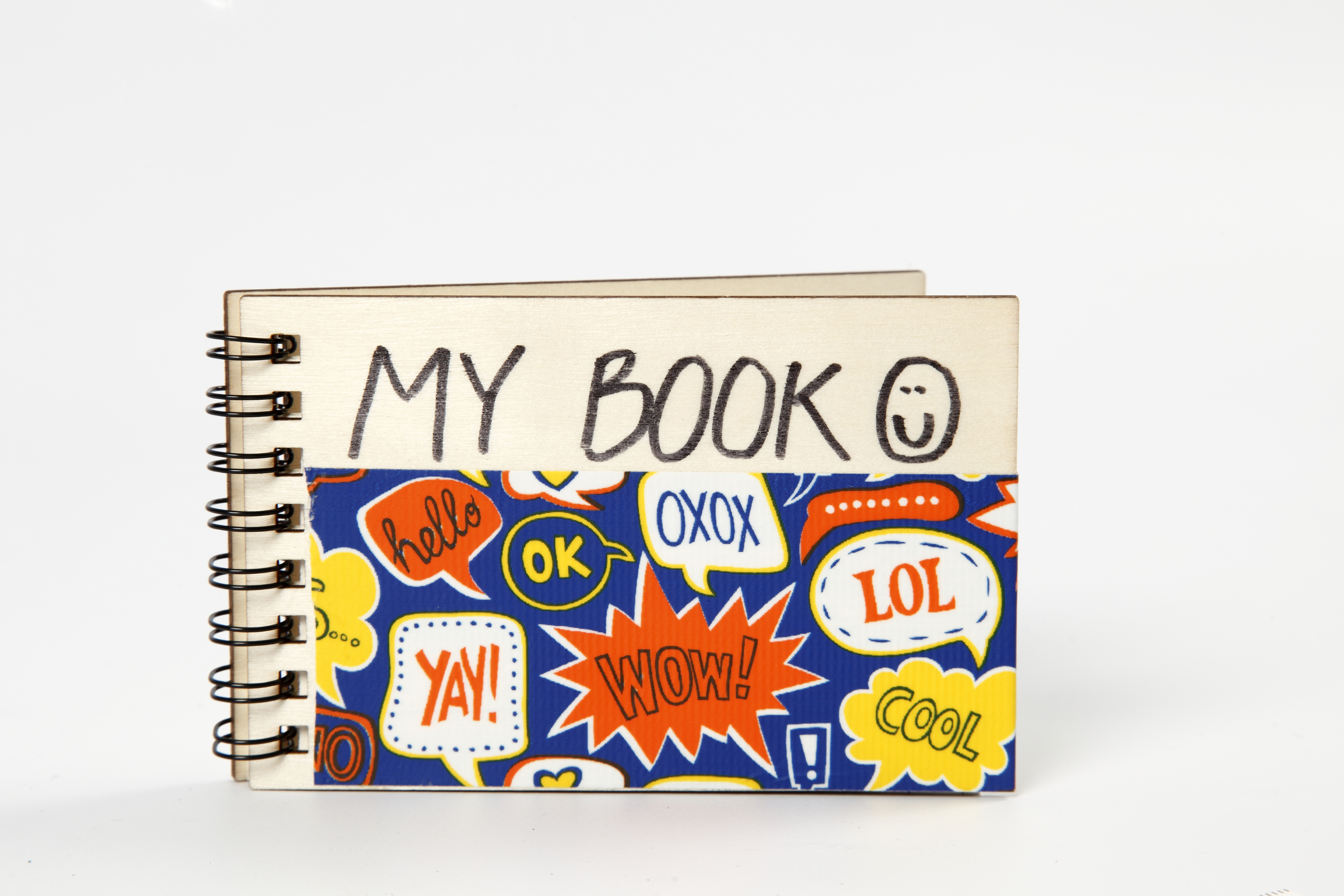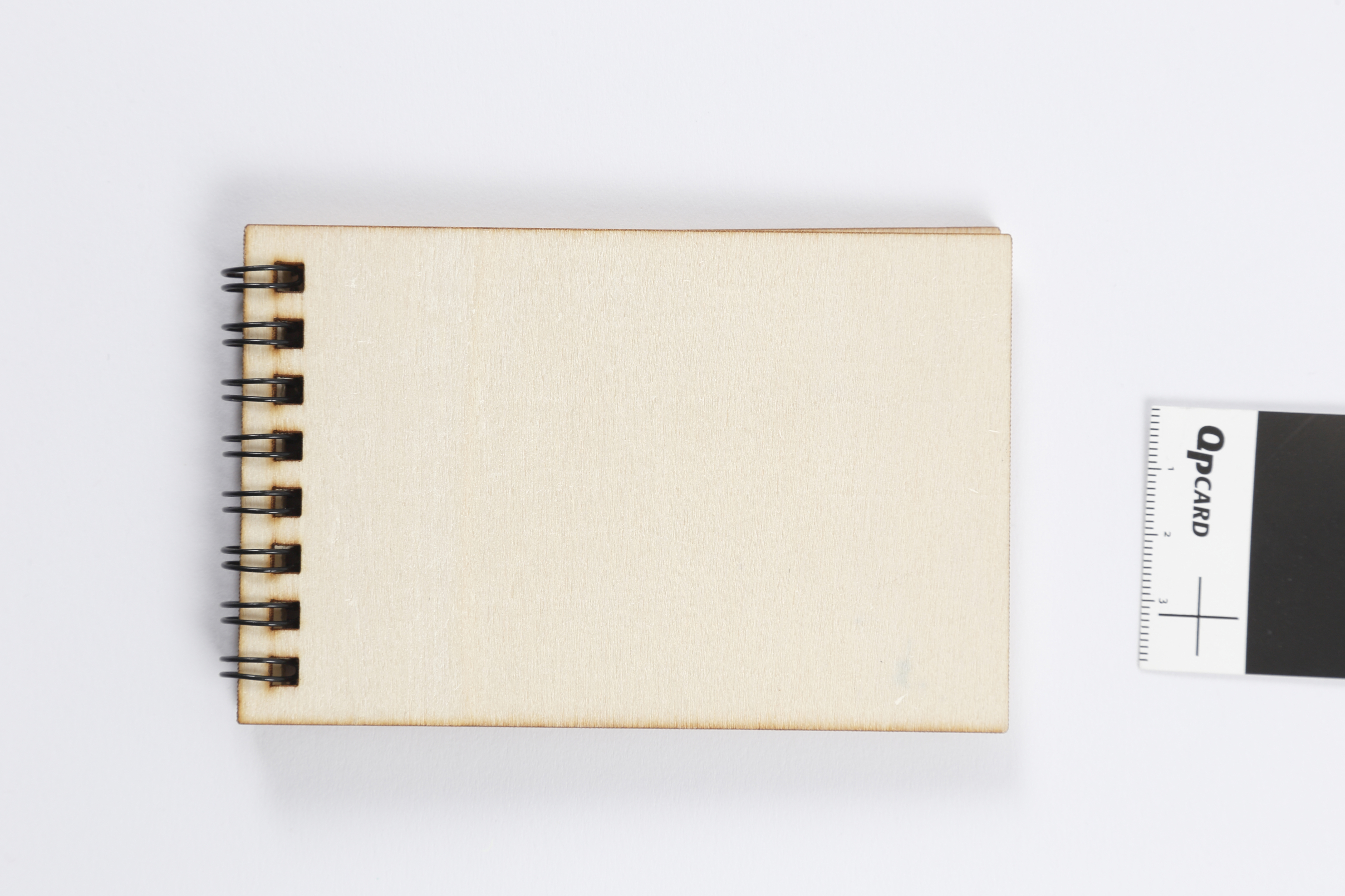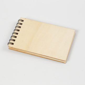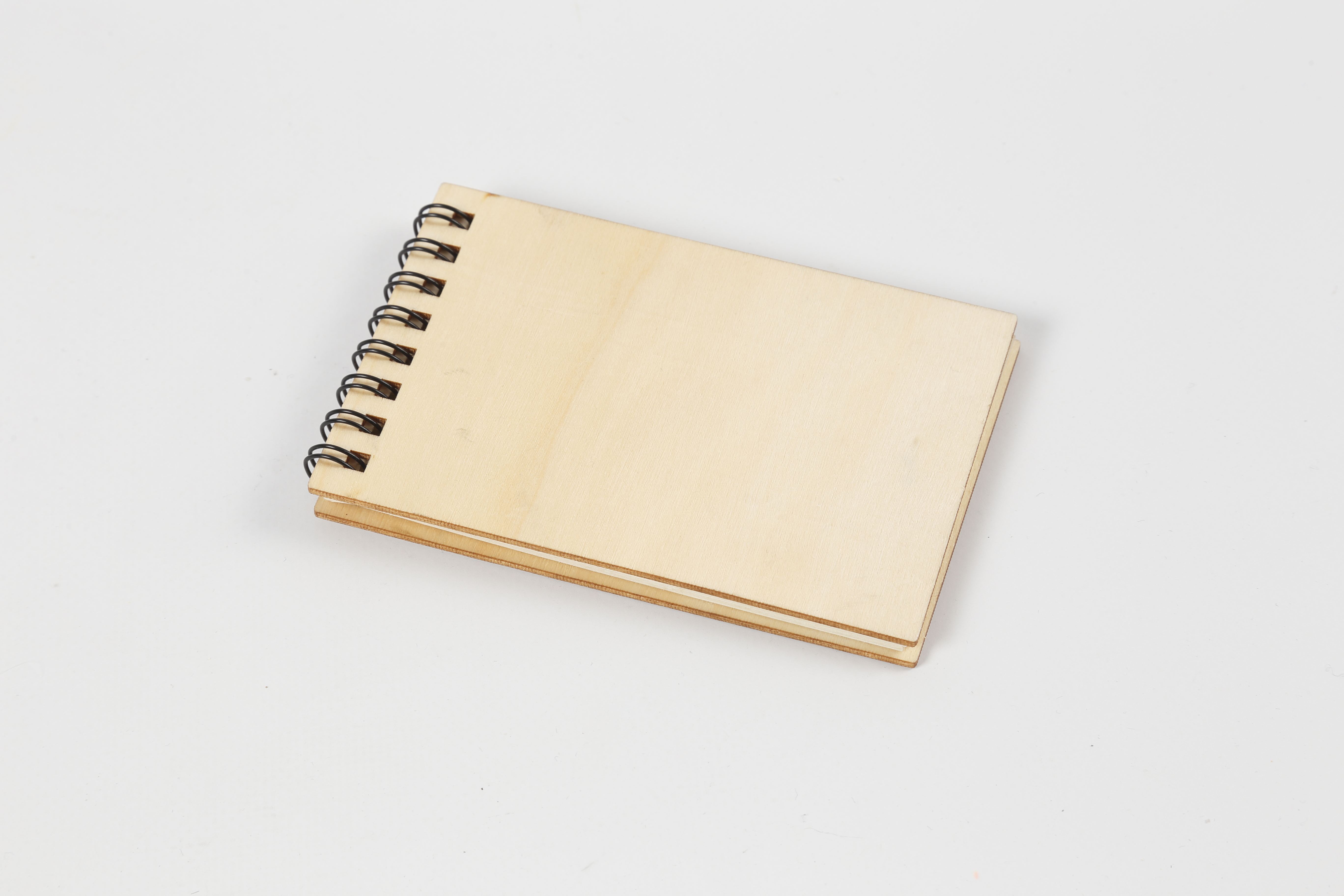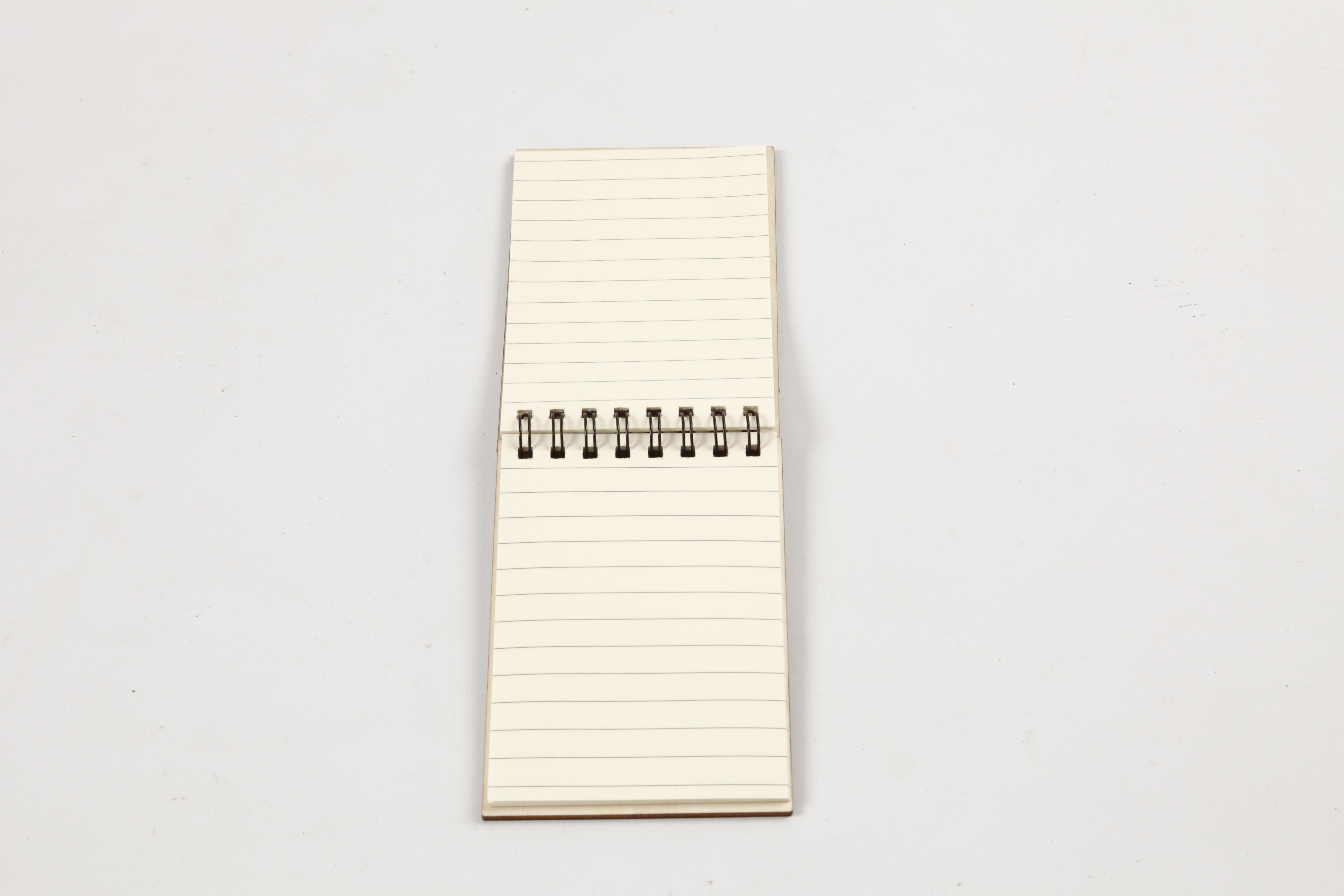 Spiralbok med fram- och baksida av ljust trä och 23 linjerade sidor.
